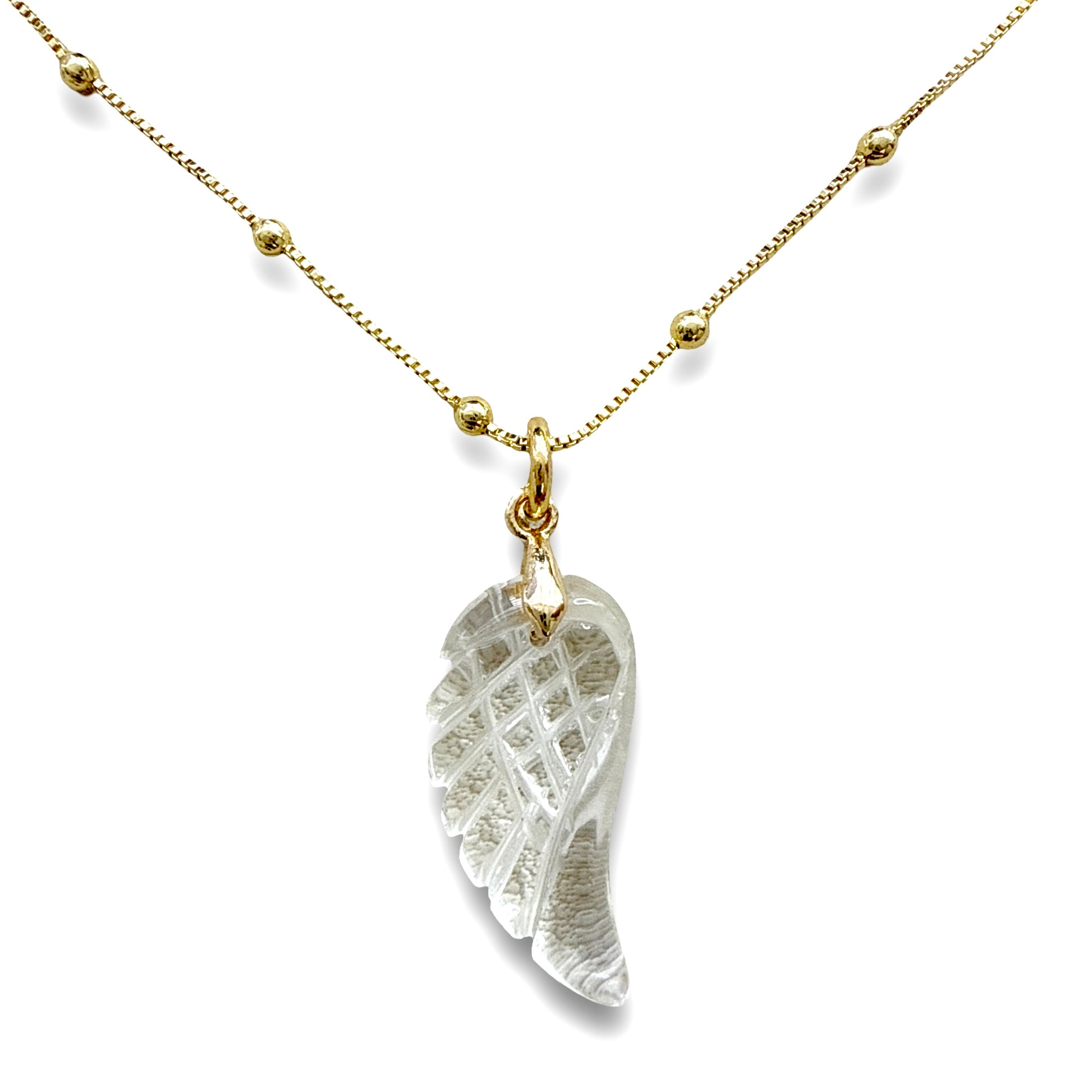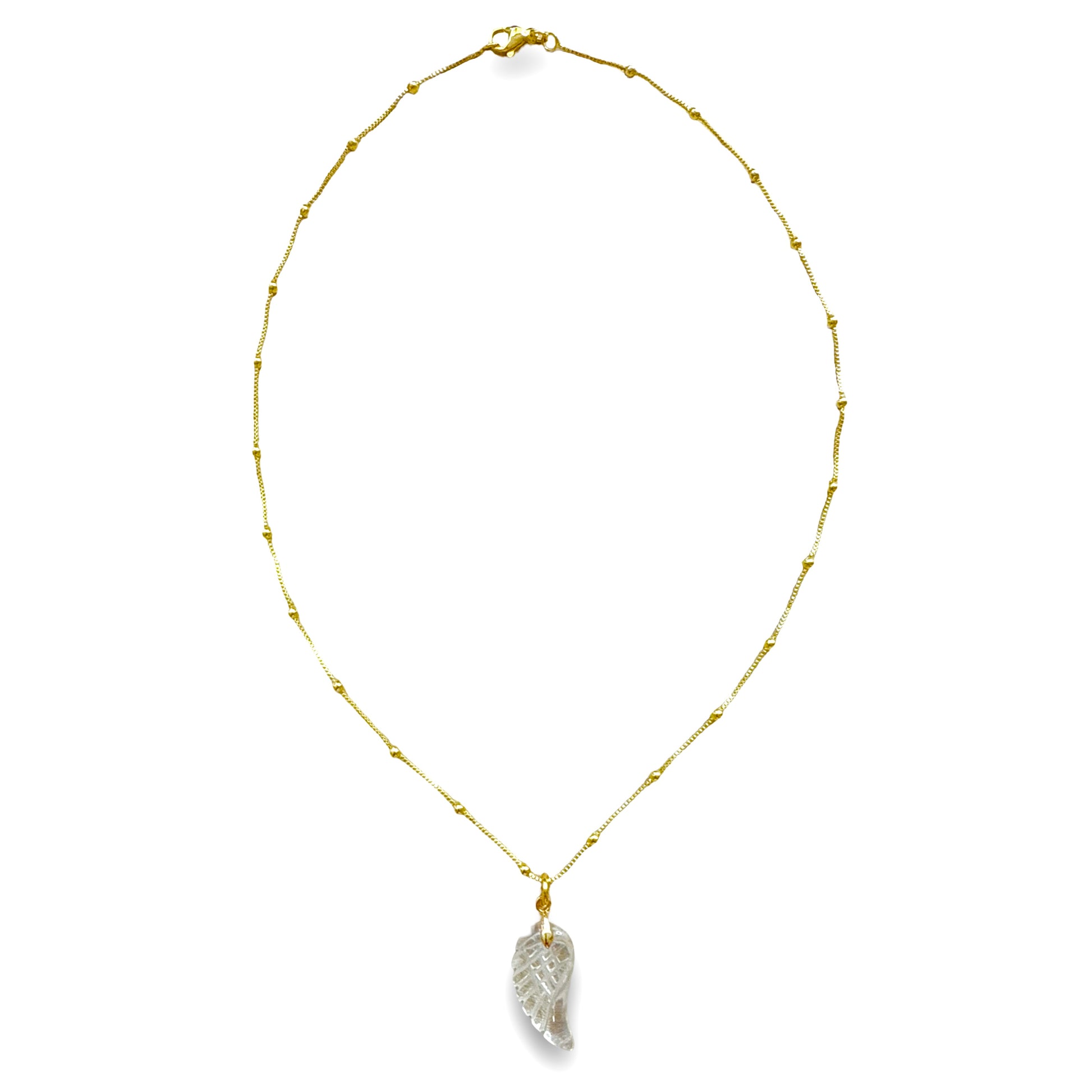 The Angel Wing Blessing Necklace features a sophisticated gold curb chain paired with a clear quartz angel wing charm. This elegant design blends timeless style with meaningful symbolism, as clear quartz is known for promoting clarity and positive energy. Perfect for everyday wear or special occasions, this necklace offers both aesthetic appeal and a sense of spiritual connection.