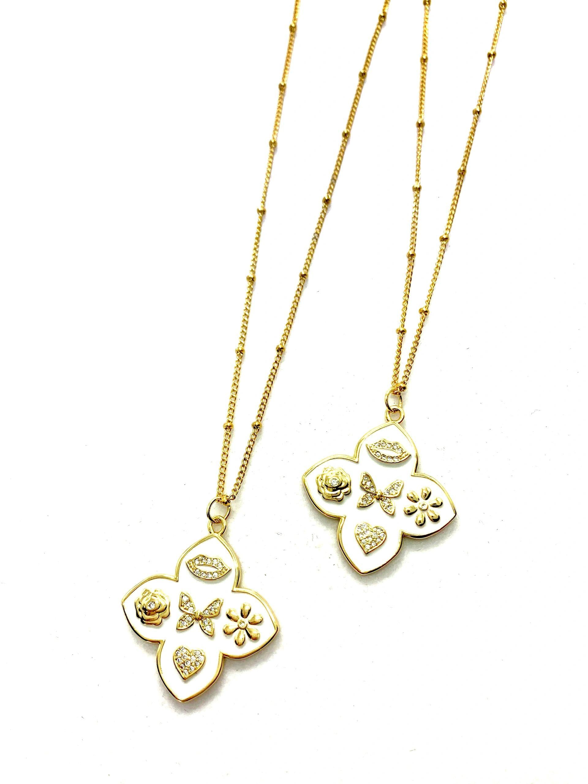 The white enamel pendant shows symbols as a reminder of the importance in life to embrace and trust our own individual process during the transformation process.