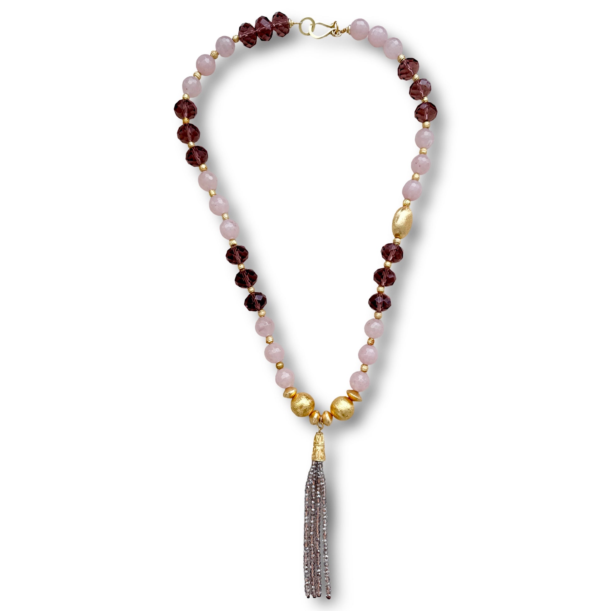 - Mixed colored crystals, burgundy and light rose, and golden beads
