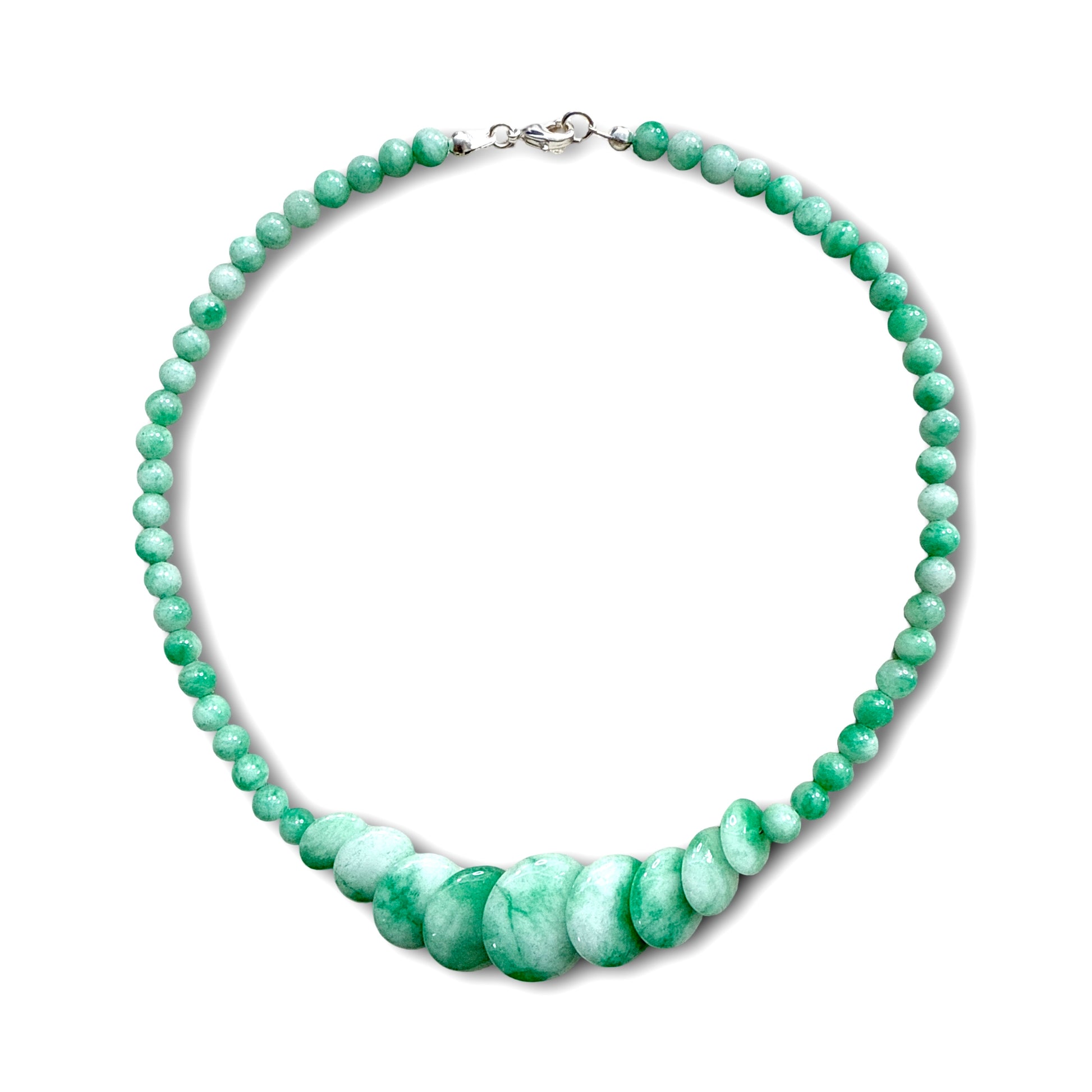 This handcrafted Jade Round Necklace features a distinctive design of gradually increasing round discs, each meticulously carved from vibrant mixed green and white jade. The smooth, polished discs transition in size, creating an elegant visual flow that highlights the natural beauty and rich hues of the jade. Perfectly balanced and lightweight, this piece combines artisanal craftsmanship with a timeless aesthetic, making it an exceptional accessory for both everyday wear and special occasions.
