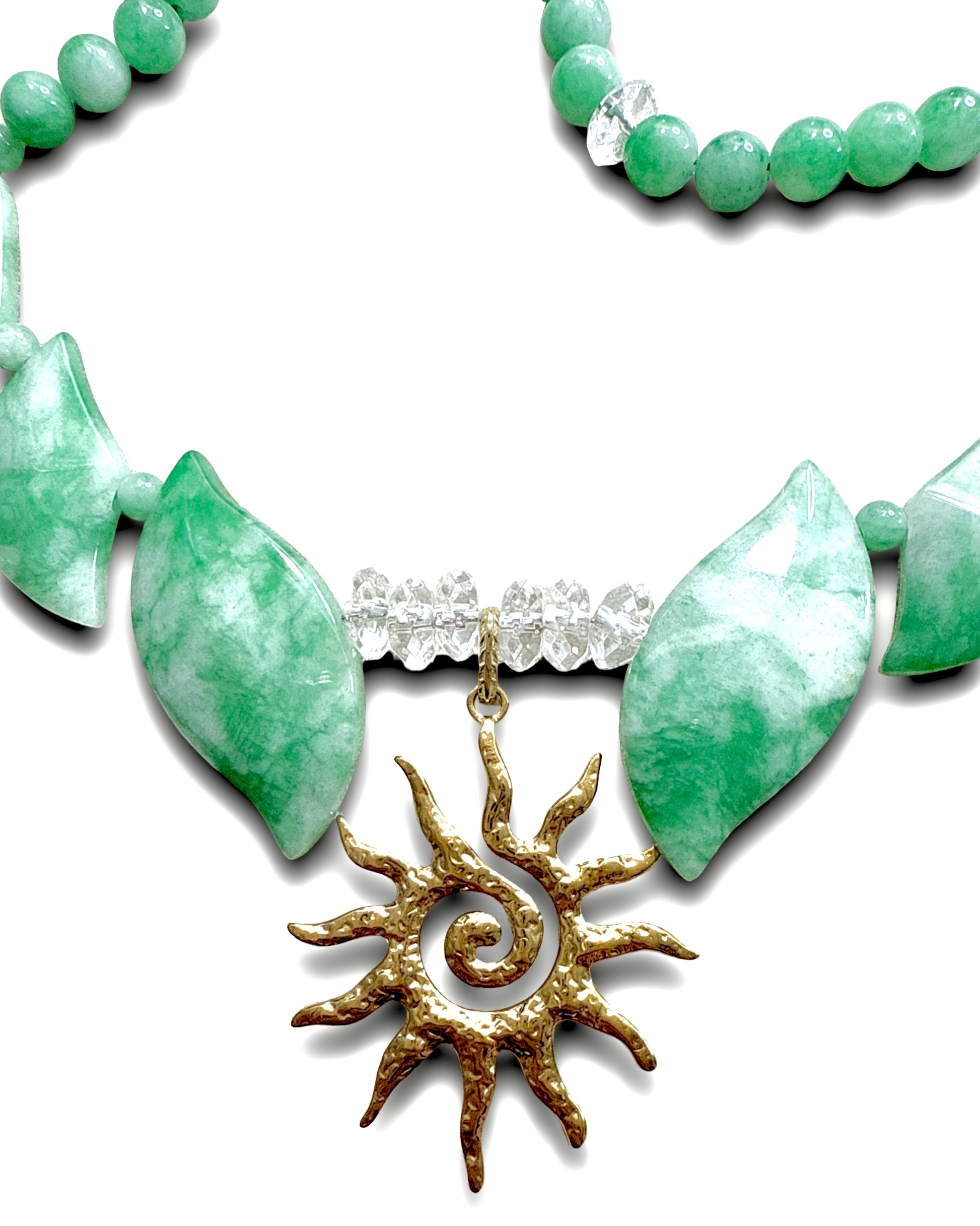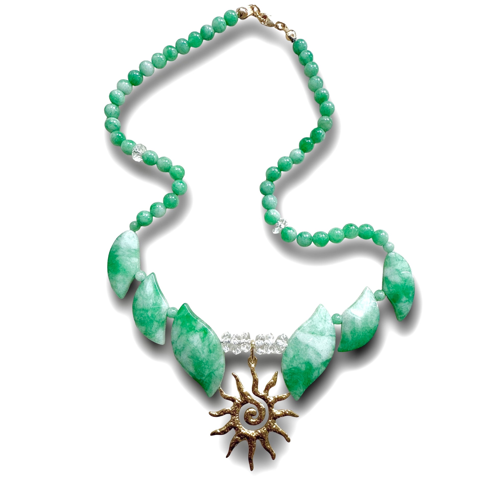 The Jade Sun Necklace combines green and white mixed jade with clear quartz crystals, centered around a distinctive sun pendant. This expertly crafted piece merges the calming, protective qualities of jade with the clarity-enhancing energy of quartz. The sun motif symbolizes vitality and renewal, making this necklace a sophisticated accessory that supports balance and positive energy throughout your day.