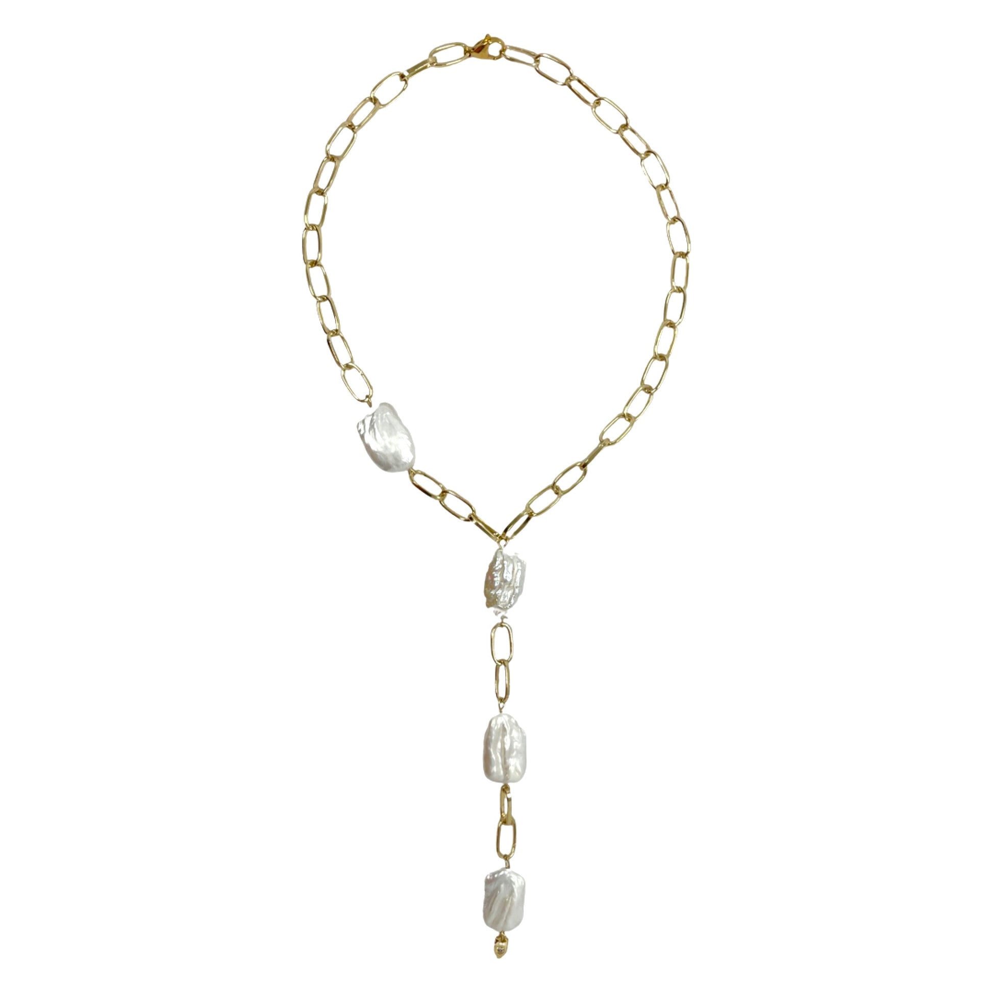 - Golden aluminum link necklace with Keshi pearls lariat style necklace