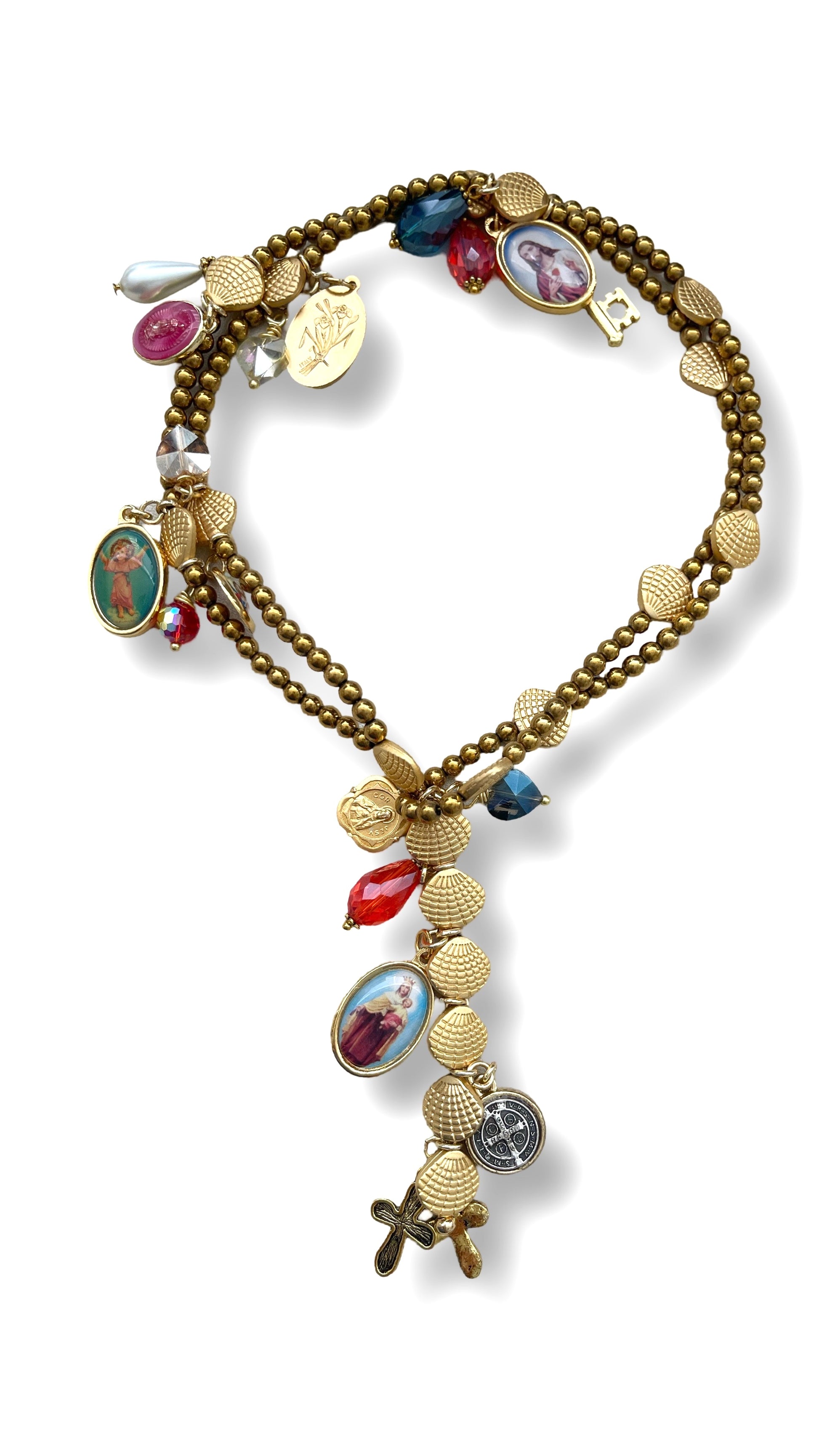 Long lariat design necklace that can be styled as a regular long necklace, layering double shocker with the optional adjustable link or simply as a double shocker, all letting the 4” drop, showing off its shell’s mixed with colorful charms and medals in its unique vintage gold and bronze finish. Creative ones can add this piece to their daily body jewelry or style your arm candy or else.