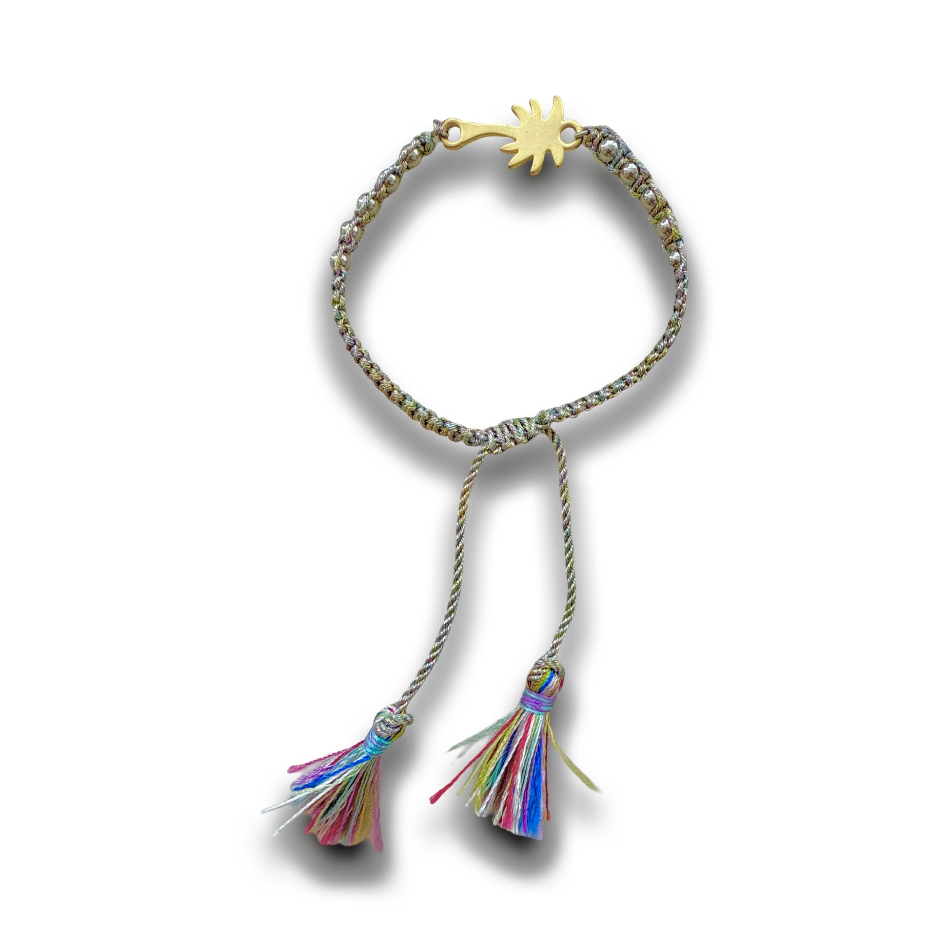 The Palma Bracelet is expertly crafted with adjustable multicolor cords, offering both comfort and a customizable fit. Its standout feature is the golden palm connector, which adds a sophisticated and distinctive accent. This bracelet combines vibrant color with refined metalwork, making it a versatile accessory suitable for various styles and occasions.