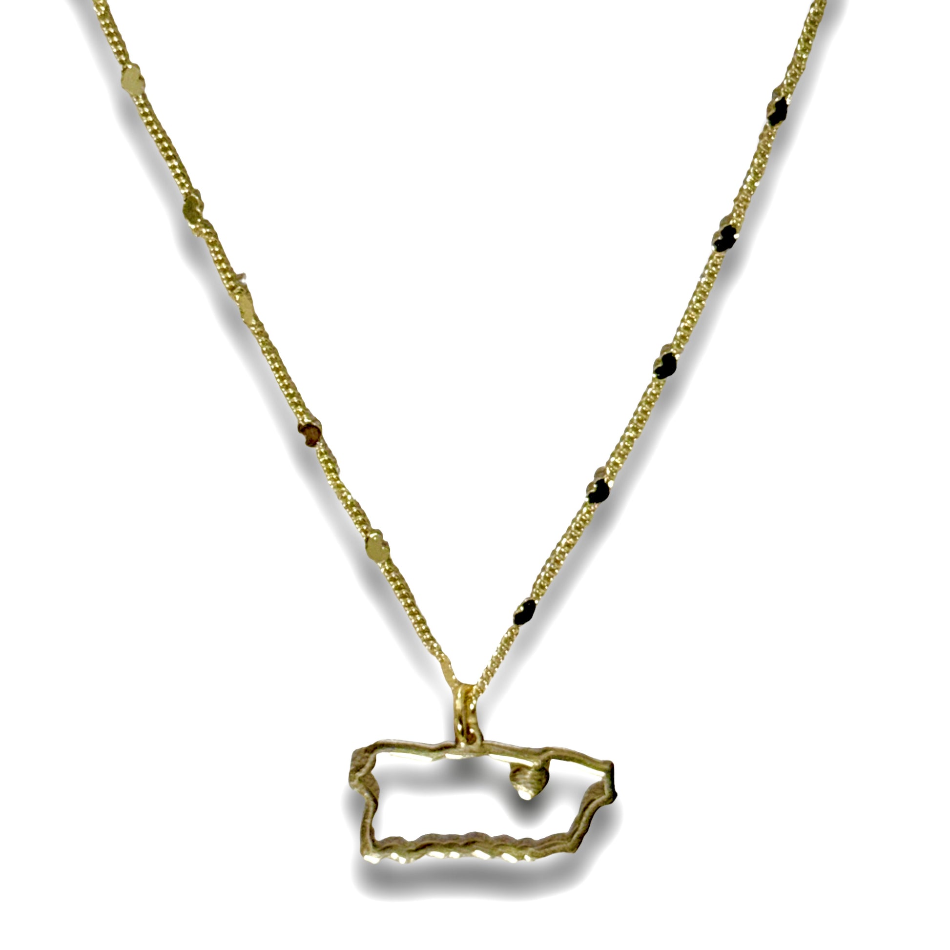 This Puerto Rico Necklace features a finely crafted gold-plated silhouette of the island, combining elegant design with cultural significance. Its durable plating ensures lasting shine, making it a sophisticated accessory that celebrates Puerto Rican heritage with subtlety and style. Ideal for everyday wear or special occasions, this necklace offers a meaningful way to keep a piece of Puerto Rico close.