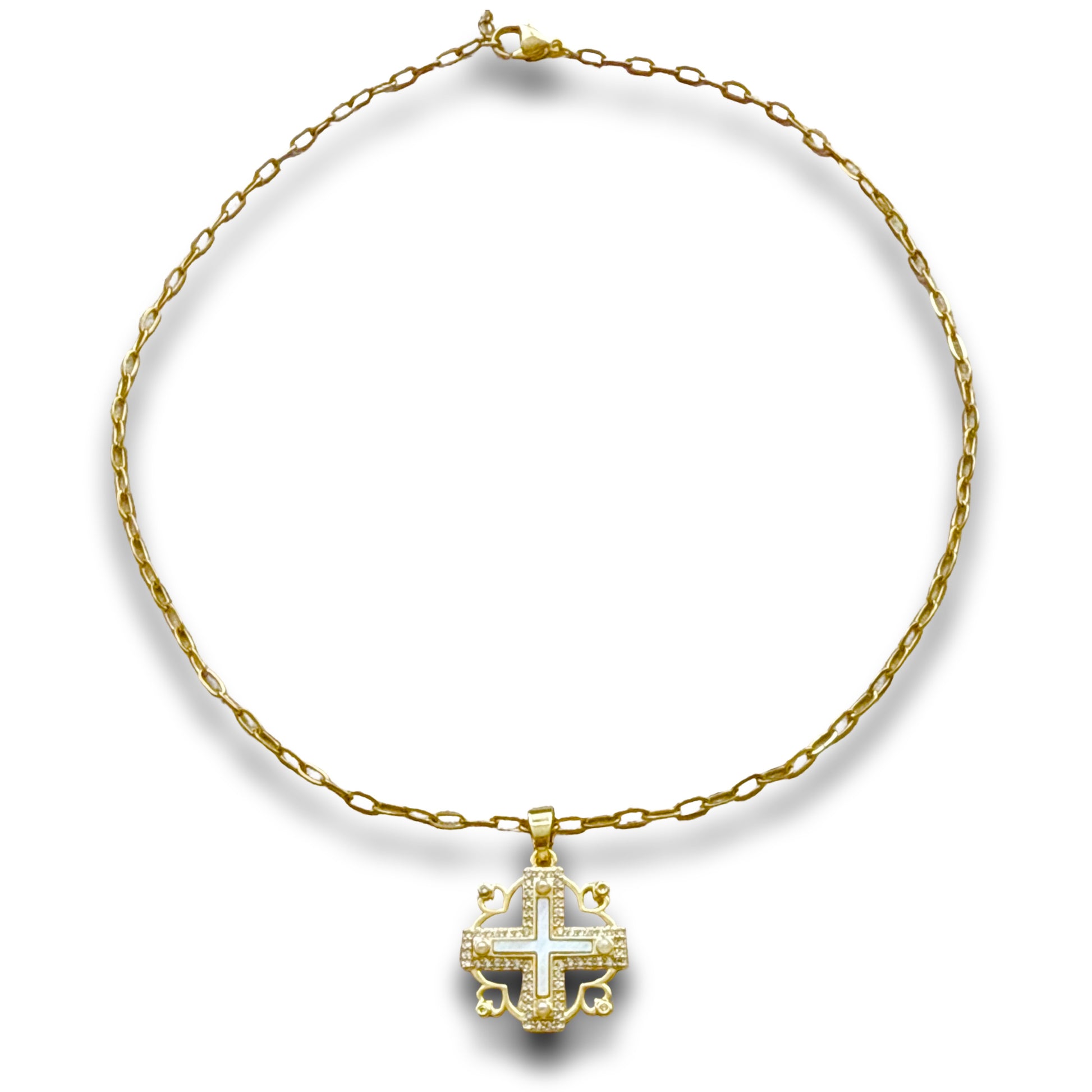 This mother of pearl cross necklace exemplifies refined religious jewelry craftsmanship. The pendant combines brass pave construction, delivering a sophisticated iridescent quality. Coated in genuine 18k gold plating, the cross pendant measures precisely 24x21x4mm with a 3.5x4mm attachment point. The accompanying 2.5mm 304 stainless steel paperclip chain, ensuring lasting brilliance. Extending 16 inches, the necklace provides optimal length for layering or standalone wear. Built for those who demand both spiritual meaning and material excellence in their devotional pieces.