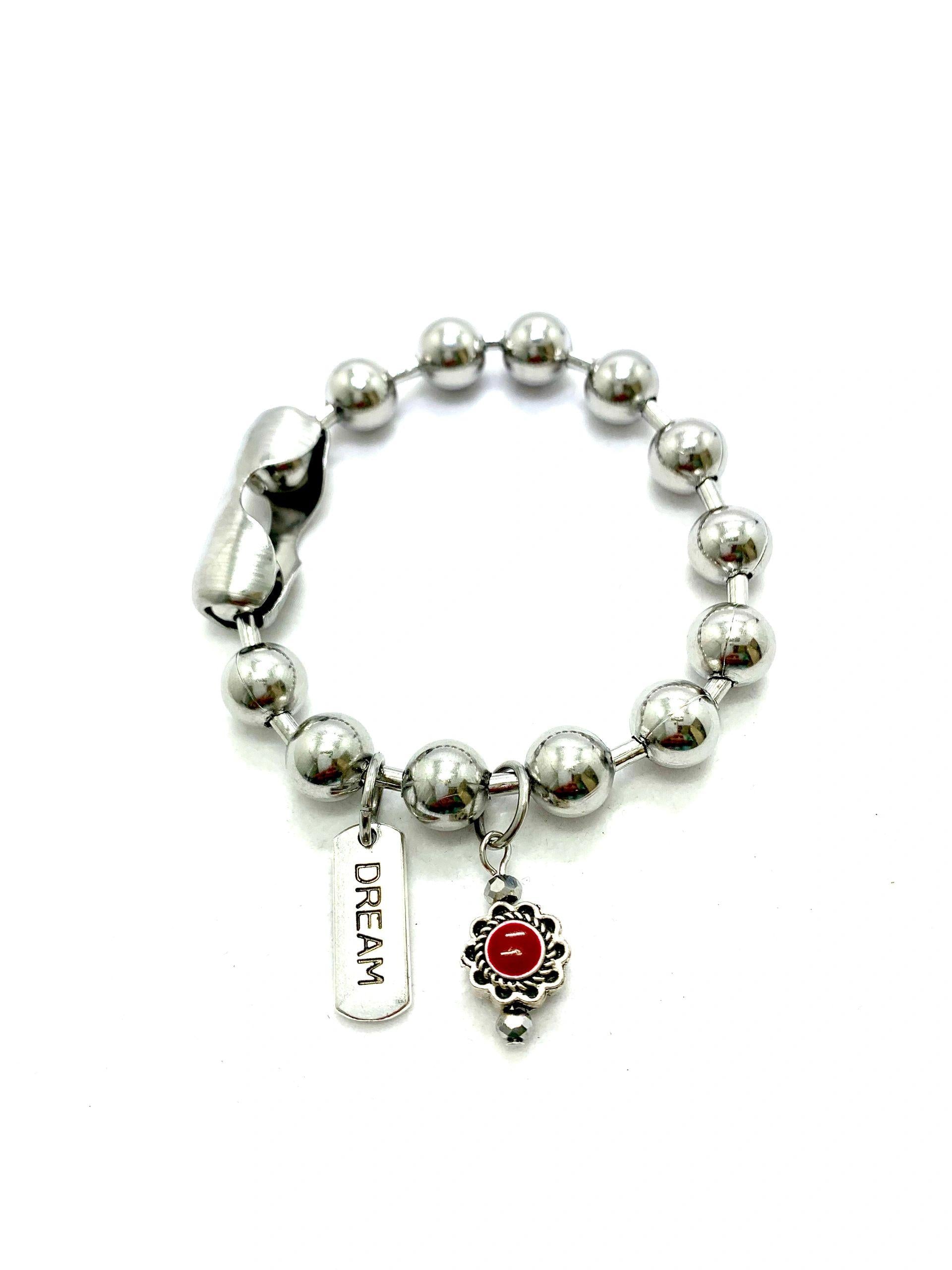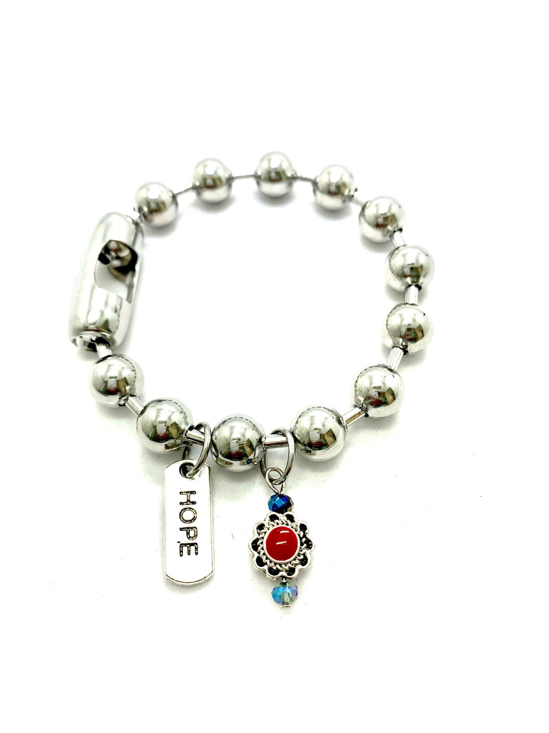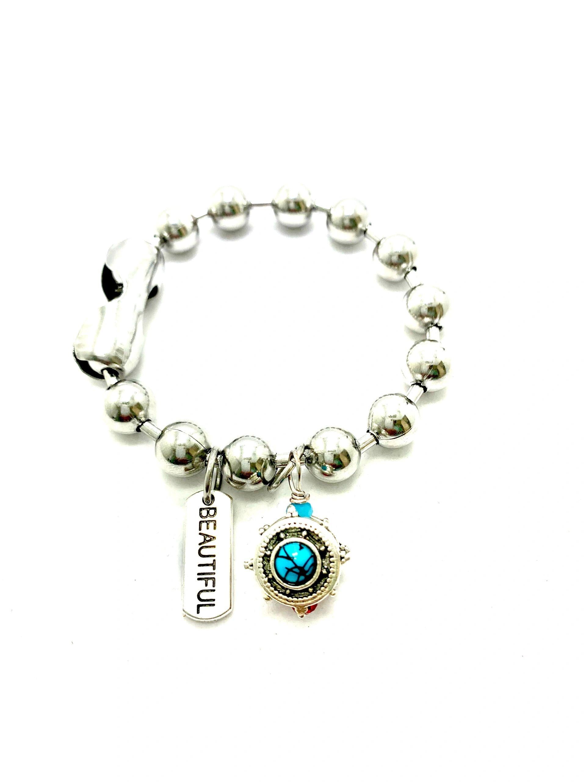 - Color: Ball chain has its natural darker silver stainless steel color and pendants/charms have red color rock on one side and blue or turquoise color on the other side.
