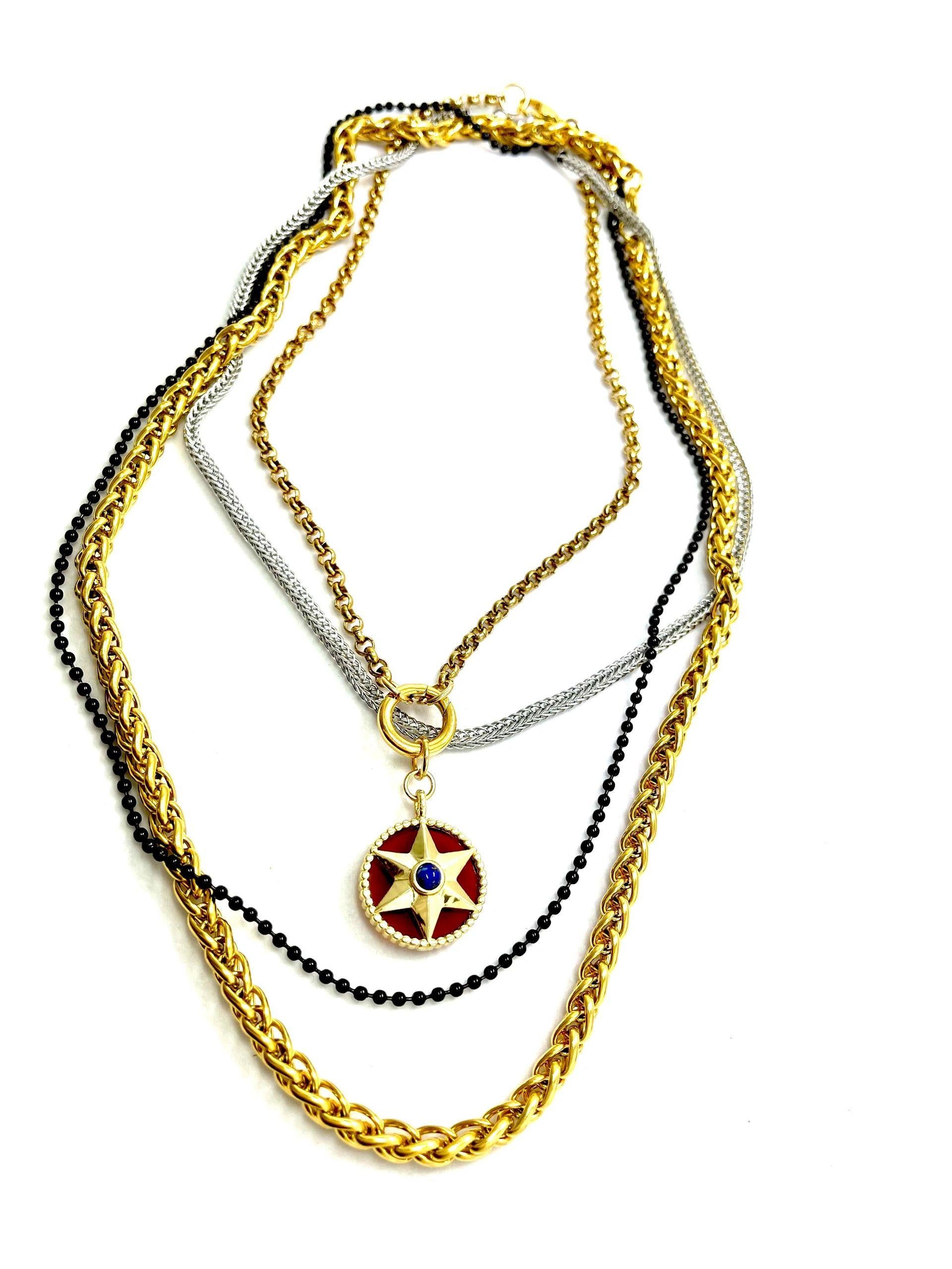 - Golden shot necklace includes push down piece for easy pendant exchange